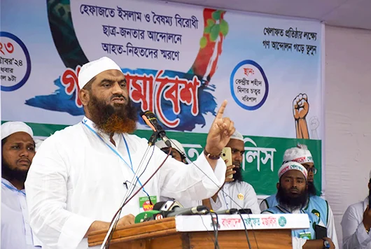 বুধবার (২৩ অক্টোবর) বরিশাল নগরীর কেন্দ্রীয় শহীদ মিনার প্রাঙ্গণে জেলা খেলাফত মজলিস আয়োজিত গণসমাবেশে প্রধান অতিথির বক্তব্যে এ আহ্বান জানান তিনি।
