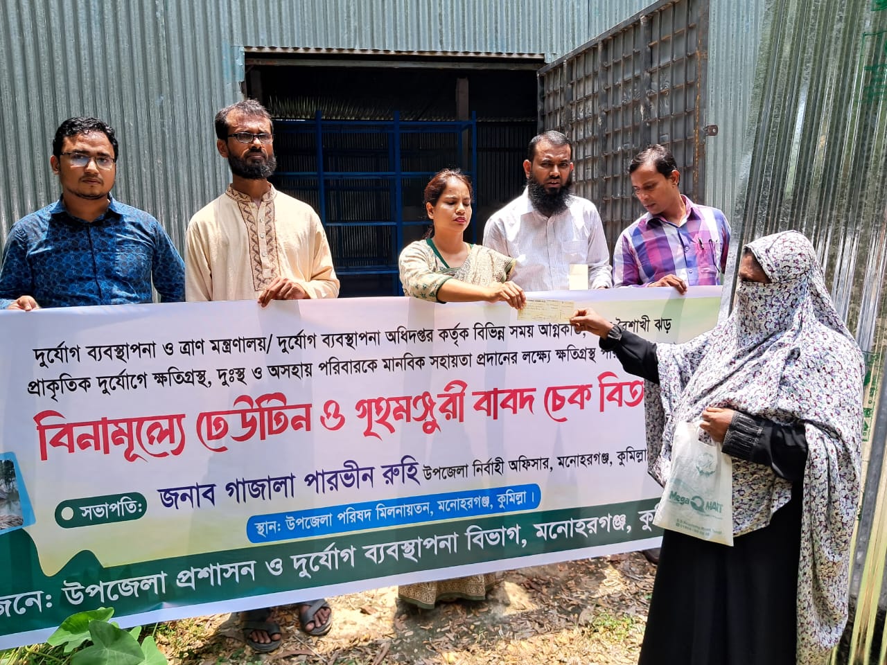 দুর্যোগ ব্যবস্থাপনা ও ত্রাণ মন্ত্রণালয়/দুর্যোগ ব্যবস্থাপনা অধিদপ্তর কর্তৃক বিভিন্ন সময়ে অগ্নিকাণ্ড, কালবৈশাখী ঝড়, প্রাকৃতিক দুর্যোগে ক্ষতিগ্রস্ত, দুঃস্থ অসহায় পরিবারকে মানবিক সহায়তা প্রদানের লক্ষে ক্ষতিগ্রস্ত পরিবারের মাঝে মনোহরগঞ্জ উপজেলা প্রশাসন ও উপজেলা দুর্যোগ ব্যবস্থাপনা বিভাগের উদ্যোগে বিনা মূল্যে ঢেউটিন ও গৃহমঞ্জুরি বাবদ চেক বিতরণ করা হয়েছে। বুধবার উপজেলা চত্বরে উপজেলা নির্বাহী অফিসার গাজালা পারভীন রুহির সভাপতিত্বে, উপজেলা প্রকল্প বাস্তবায়ন কর্মকর্তা আহমেদ উল্লাহ সবুজের সার্বিক তত্বাবধানে উপজেলার বিভিন্ন ইউনিয়নের ৩৬টি অসহায় পরিবারের প্রতি পরিবারকে ২ বাণ্ডিল ঢেউটিন এবং ৬ হাজার টাকার চেক, একটি পরিবারকে ৩ বাণ্ডিল ঢেউটিন ও ৯ হাজার টাকার চেক মোট ৩৭টি পরিবারের মাঝে ৭৫ বান্ডিল এবং ২ লাখ ২৫ হাজার টাকার চেক প্রদান করা হয়। এসময় উপস্থিত ছিলেন মনোহরগঞ্জ প্রেসক্লাবের সভাপতি মোঃ আবু ইউসুফ, উপজেলা ত্রাণ ও দুর্যোগ ব্যবস্থাপনা বিভাগের উপসহকারী প্রকৌশলী সুলতান মাহমুদসহ অন্যান্য কর্মকর্তারা। ঢেউটিন ও গৃহমঞ্জুরি বাবদ নগদ টাকার চেক পেয়ে উপস্থিত উপকার ভোগী পরিবারগুলোর মুখে হাসি ফুটে ওঠে এবং তারা উপজেলা প্রশাসনকে ধন্যবাদ জানান।
