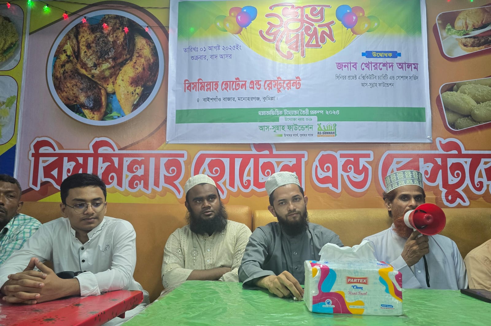 উদ্বোধনী অনুষ্ঠানে প্রধান অতিথি হিসেবে ফাউন্ডেশনের সিনিয়র এক্সিকিউটিভ জনাব খোরশেদ আলম সাহেব উপস্থিত থাকার কথা থাকলেও, তিনি ব্যক্তিগত কারণবশত উপস্থিত হতে পারেননি। তার পক্ষ থেকে উপস্থিত ছিলেন ফাউন্ডেশনের মনোহরগঞ্জের স্বেচ্ছাসেবক, ও স্থানীয় প্রতিনিধি মাওলানা আরিফুল ইসলাম মাহফুজ ও এলাকার গণ্যমান্য ব্যক্তিবর্গ উপস্থিত থেকে হোটেলটির উদ্বোধন করেন।