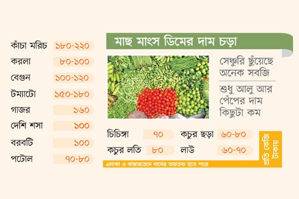 রাজধানীর বিভিন্ন বাজারে খোঁজ নিয়ে জানা গেছে, আলু ও পেঁপে ছাড়া প্রায় সব সবজিই বিক্রি হচ্ছে ৭০ থেকে ১১০ টাকার মধ্যে। কাঁচা মরিচ ১৮০-২২০, করলা ৮০-১০০, বেগুন ১০০ থেকে ১২০, টম্যাটো ১৫০ থেকে ১৮০, গাজর ১৬০, দেশি শসা ১০০ ও হাইব্রিড ৭০ টাকা কেজি দরে বিক্রি হচ্ছে। এ ছাড়া বরবটি ১০০, পটোল, চিচিঙ্গা ও ধুন্দল ৭০-৮০, কচুর লতি ৮০, কচুর ছড়া ৬০-৮০, লাউ ৬০-৭০ টাকা কেজি বিক্রি হচ্ছে। নগরীর অলিগলির সবজির দোকানগুলোয় প্রায় সবজি ৯০ থেকে ১২০ টাকা কেজি বিক্রি হচ্ছে। বাজারে মানভেদে পিঁয়াজ ৮০-৮৫ টাকা, যা তিন সপ্তাহ আগেও ৬০-৬৫ টাকা ছিল। পাড়ার দোকানে পিঁয়াজ ৯০-৯৫ টাকা।