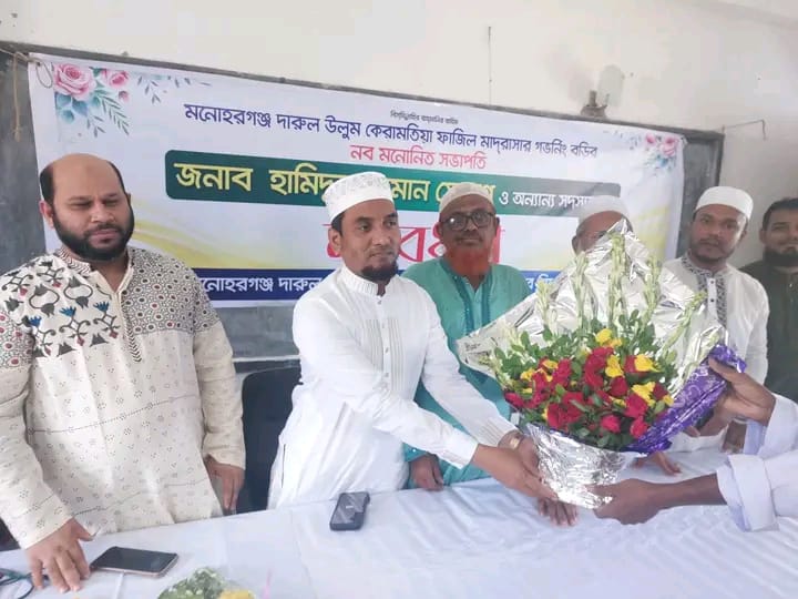 কুমিল্লার মনোহরগঞ্জ দারুল-উলুম কেরামতিয়া ফাজিল মাদ্রাসার নবগঠিত গভর্নিং কমিটির সভাপতি হামিদুর রহমান সোহাগ ও সদস্যদের সংবর্ধনা দিয়েছেন শিক্ষক শিক্ষার্থীরা। মাদরাসা হলরুমে, মাদরাসার অধ্যক্ষ মাওলানা জিন্নাত আলীর নেতৃত্বে এই সংবর্ধনা দেয়া হয়। এসময় উপস্থিত ছিলেন গভর্নিং বডির সহ-সভাপতি মনোনীত চিকিৎসক সদস্য ডাক্তার কাউসার হামিদ, বিদ্যোৎসাহী সদস্য হিসাবে মাওলানা আব্দুল হাই (দিশাবন্দ), শাজাহান বি,এস,সি ( তাহেরপুর), কেফায়েত উল্লাহ কাসফী ( হাটিরপাড়), দাতা সদস্য হিসেবে মনোনীত হয়েছেন। মোঃ জসিম উদ্দিন (ঝলম) প্রতিষ্ঠাতা দাতা সদস্য মোঃ সাফায়েত হোসেন সুমন ( হাটিরপাড়), অভিভাবক সদস্য হিসেবে মনোনীত হয়েছেন, মো: সালেহ আহম্মেদ (দিশাবন্দ), কবির হোসেন ( ঝলম), মাস্টার মিজানুর রহমান ( তাহেরপুর), শিক্ষক প্রতিনিধি হিসেবে মনোনীত হয়েছেন মাওলানা আব্দুর রহিম, মাওলানা সিদ্দিকুর রহমান, মো নাছির উদ্দিন বি,এস,সি, পদাধিকার বলে সদস্য সচিব হিসেবে মনোনীত হয়েছেন অত্র মাদ্রাসার অধ্যক্ষ মাওলানা জিন্নাত আলী।