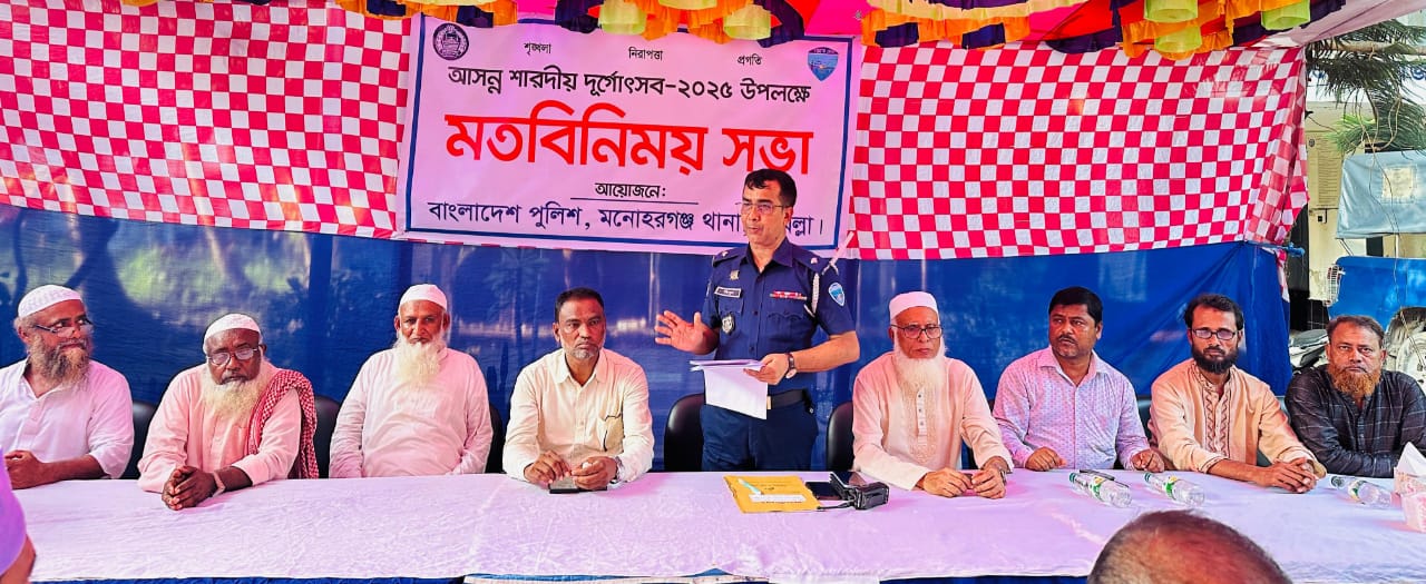 মনোহরগঞ্জ থানার উদ্যোগে ওপেন হাউসডে এবং আসন্ন শারদীয় দুর্গা উৎসব উদযাপন উপলক্ষে মতবিনিময় সভা অনুষ্ঠিত হয়েছে। শুক্রবার থানা চত্বরে অফিসার ইনচার্জ বিপুল চন্দ্র দের সভাপতিত্বে মতবিনিময় সভায় প্রধান অতিথি হিসেবে বক্তব্য রাখেন উপজেলা বিএনপির সভাপতি ইলিয়াস পাটওয়ারী। এসময় বক্তব্য রাখেন মনোহরগঞ্জ উপজেলা বিএনপির সাংগঠনিক সম্পাদক মাসুদুল আলম বাচ্চু, মনোহরগঞ্জ প্রেসক্লাবের সভাপতি মোঃ আবু ইউসুফ, সাংবাদিক আবুল খায়ের, জামায়াতের যুব বিভাগের সভাপতি মু মহিউদ্দিন, খেলাফত মজলিসের সভাপতি হাফেজ মাওলানা আবদুস সালাম, হেফাজতে ইসলামের সভাপতি মাওলানা সহিদ উল্লাহ, যুগ্ম সাধারণ সম্পাদক হাফেজ নিজাম উদ্দিন, জমিয়তে উলামায়ে ইসলাম বাংলাদেশ মনোহরগন্জ উপজেলা শাখা সভাপতি মাওলানা আহমদুল্লাহ, মনোহরগঞ্জ উপজেলা পূজা উদযাপন কমিটির সভাপতি রণজিৎ চন্দ্র মজুমদার। এছাড়াও উপস্থিত ছিলেন বিভিন্ন রাজনৈতিক দলের নেতৃবৃন্দ। মতবিনিময় সভায় বক্তারা মাদকের ভয়াবহতা তুলে ধরে ইউনিয়ন ভিত্তিক সামাজিকভাবে প্রতিরোধের জন্য সবার প্রতি আহ্বান জানানো হয়। এছাড়া আসন্ন শারদীয় দুর্গা পূজায় যেন কোনো অপ্রীতিকর ঘটনা না ঘটে সেদিকে খেয়াল রাখার জন্য সকল রাজনৈতিক দলের নেতাকর্মীদের প্রতি অনুরোধ করা হয়।