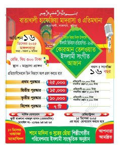 কুমিল্লা জেলার লাকসামের ঐতিহ্যবাহী বাতাখালী হাফিজিয়া মাদ্রাসা ও এতিমখানার উদ্যোগে বার্ষিক ইসলামী জিনিয়াস প্রতিযোগিতা ২০২৫ আগামী ১৬ই ডিসেম্বর মঙ্গলবার সকাল ৮টায় অনুষ্ঠিত হবে।