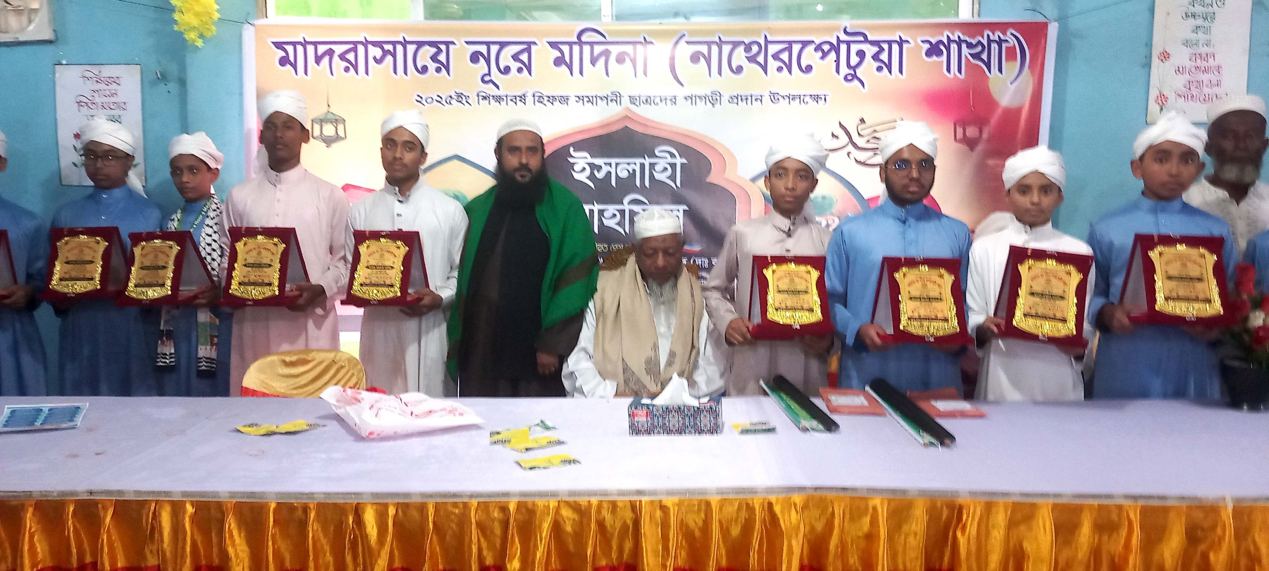 মোঃ আলমগীর হোসেন: কুমিল্লার মনোহরগঞ্জ উপজেলার নাথেরপেটুয়ায় অবস্থিত মাদরাসায়ে নূরে মদিনায় ২০২৫ সালের হিফজ বিভাগ থেকে কোরআন শরীফ হিফজ সমাপনকারী ১০ জন শিক্ষার্থীকে পাগড়ী ও ক্রেস্ট প্রদান এবং ইসলাহী মাহফিল অনুষ্ঠিত হয়েছে। বুধবার (১০ ডিসেম্বর) মাদরাসা মিলনায়তনে এক মনোরম পরিবেশে এ আয়োজন সম্পন্ন হয়।