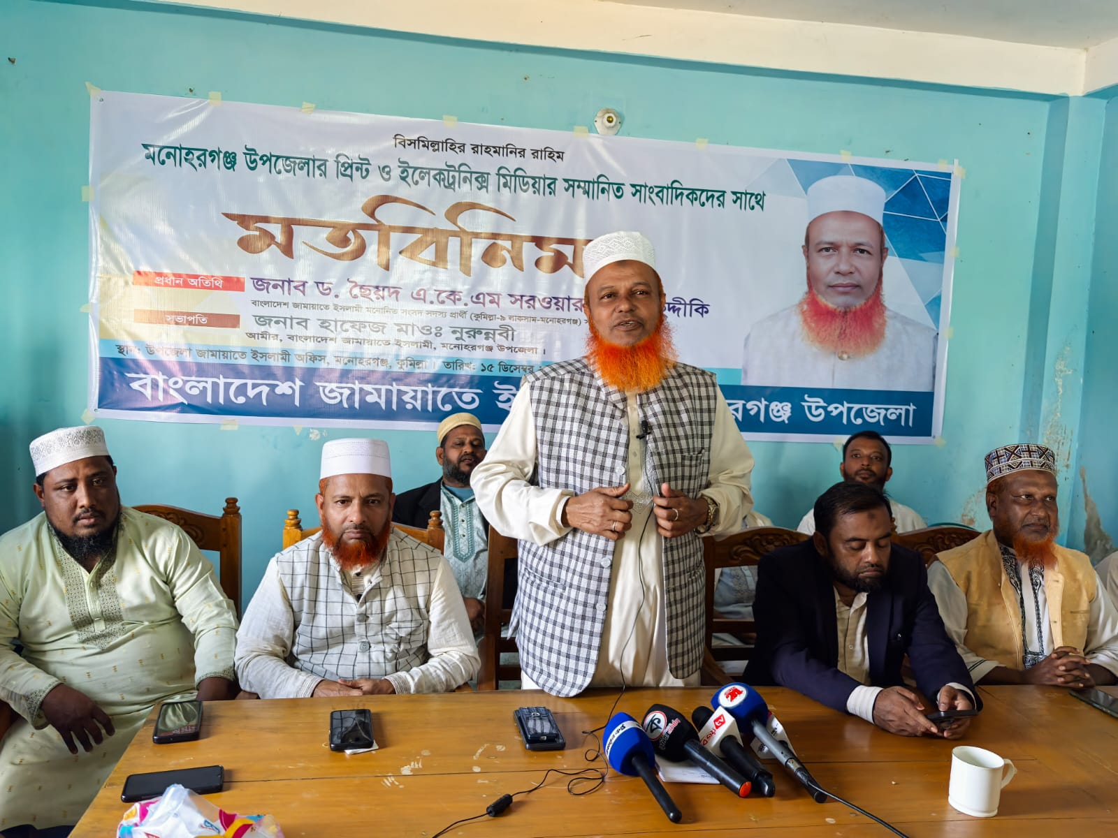 কুমিল্লার মনোহরগঞ্জ উপজেলার প্রিন্ট ও ইলেকট্রনিক মিডিয়ায় কর্মরত সাংবাদিকদের সাথে উপজেলা জামায়াতের আয়োজনে মতবিনিময় সভার আয়োজন করা হয়েছে। সোমবার (১৫ডিসেম্বর)দুপুর ২টায় উপজেলা জামায়াতের কার্যালয়ে অনুষ্ঠিত মতবিনিময় সভায় প্রধান অতিথি ছিলেন কুমিল্লা-৯ (লাকসাম -মনোহরগঞ্জ) আসনে জামায়াতে ইসলামী মনোনীত সংসদ সদস্য পদপ্রার্থী অধ্যাপক ড.এ কে এম সৈয়দ সরওয়ার উদ্দিন সিদ্দিকী।