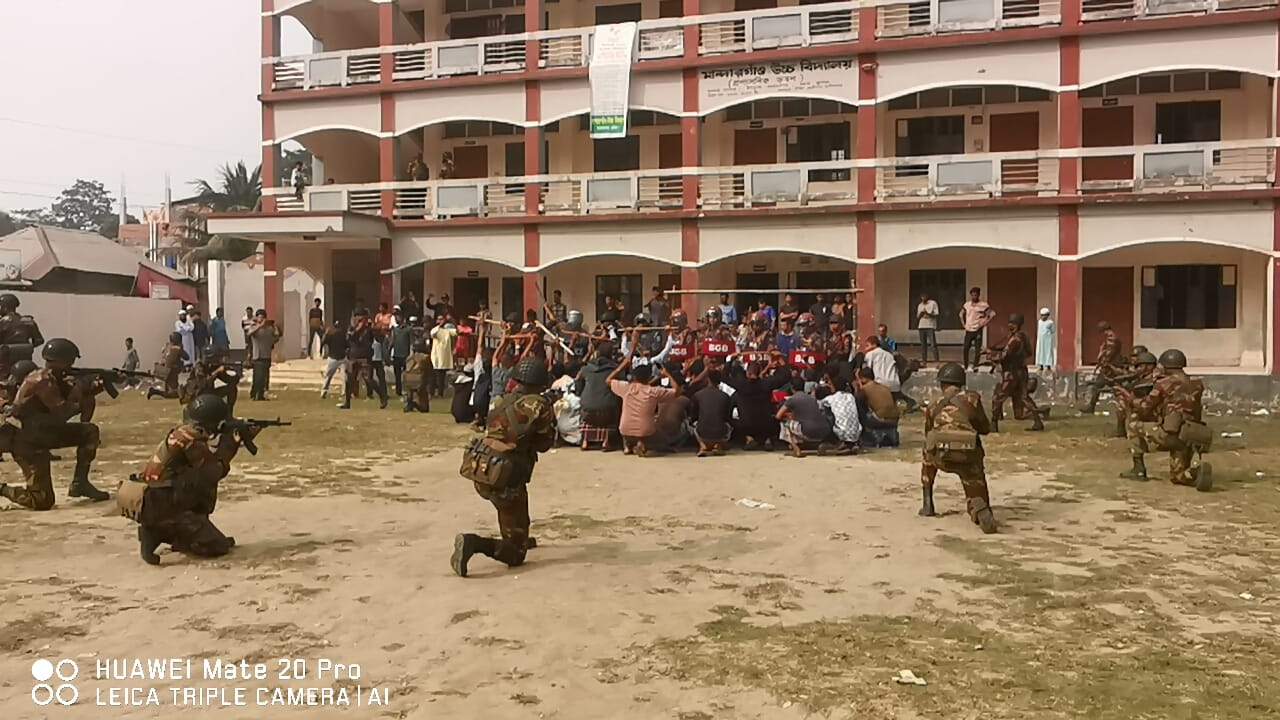 আসন্ন জাতীয় নির্বাচনে আইনশৃঙ্খলা পরিস্থিতি বিঘ্নিত করতে পারে - এমন যেকোনো উদ্ভূত পরিস্থিতি দক্ষতার সঙ্গে মোকাবেলার লক্ষ্যে সেনা সদস্যদের নিয়মিতভাবে প্রশিক্ষণ ও প্রস্তুতিমূলক কার্যক্রম পরিচালনা করা হচ্ছে। এই ধারাবাহিকতার অংশ হিসেবে আজ মনোহরগঞ্জ ক্যাম্পের দায়িত্বপূর্ণ এলাকায় অবস্থিত মান্দারগাঁও উচ্চ বিদ্যালয় মাঠে একটি পরিস্থিতিনির্ভর মহড়া (Situational Training Exercise) আয়োজন করা হয়।