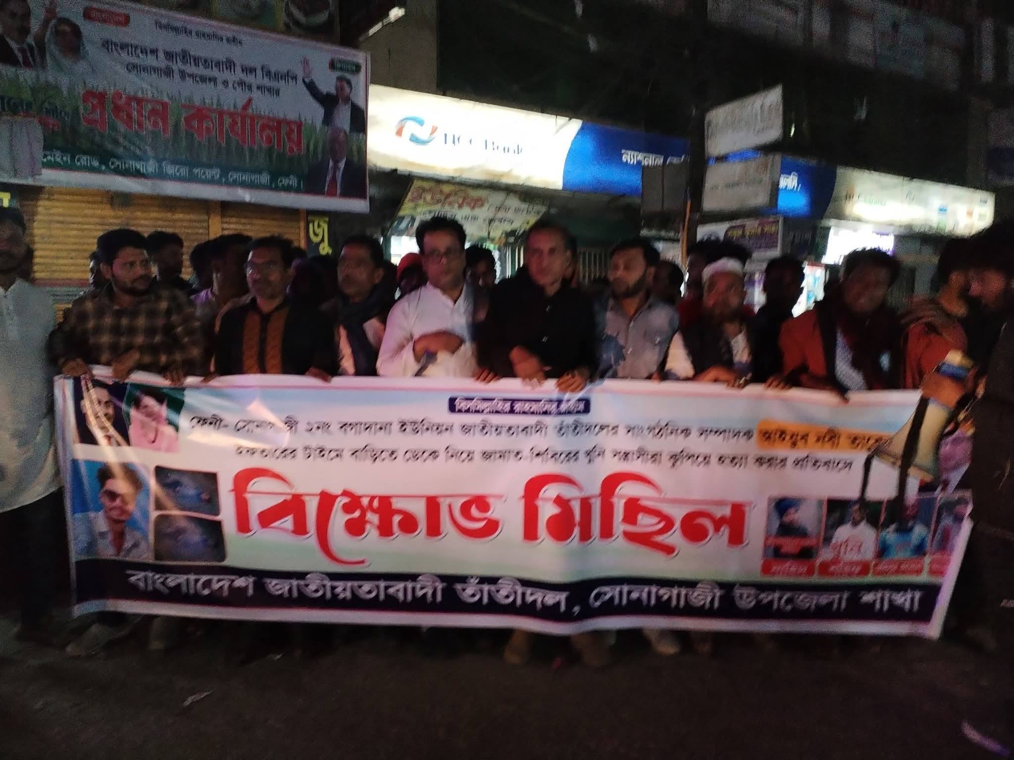 সোনাগাজী উপজেলা তাঁতি দলের আহবায়ক ইসমাইল হোসেনের সভাপতিত্বে ও সদস্য সচিব আবদুল আল আমীনের সঞ্চালনায় বিক্ষোভ মিছিল শেষে জিরো পয়েন্টে প্রতিবাদ সভায় প্রধান অতিথি হিসেবে উপস্থিত থেকে বক্তব্য রাখেন,ফেনী জেলা তাঁতিদলের আহবায়ক সারোয়ার জাহান শ্রাবন।