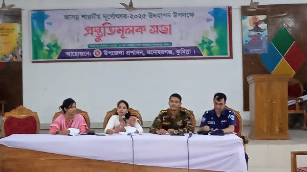 মনোহরগঞ্জ কুমিল্লা সংবাদদাতা আসন্ন শারদীয় দুর্গা উৎসব উদযাপন উপলক্ষে প্রস্তুতিমূলক সভা অনুষ্ঠিত হয়েছে। রোববার উপজেলা পরিষদ হলরুমে উপজেলা নির্বাহী অফিসার গাজালা পারভীন রুহির সভাপতিত্বে প্রস্তুতিমূলক সভায় বক্তব্য রাখেন সহকারী কমিশনার
